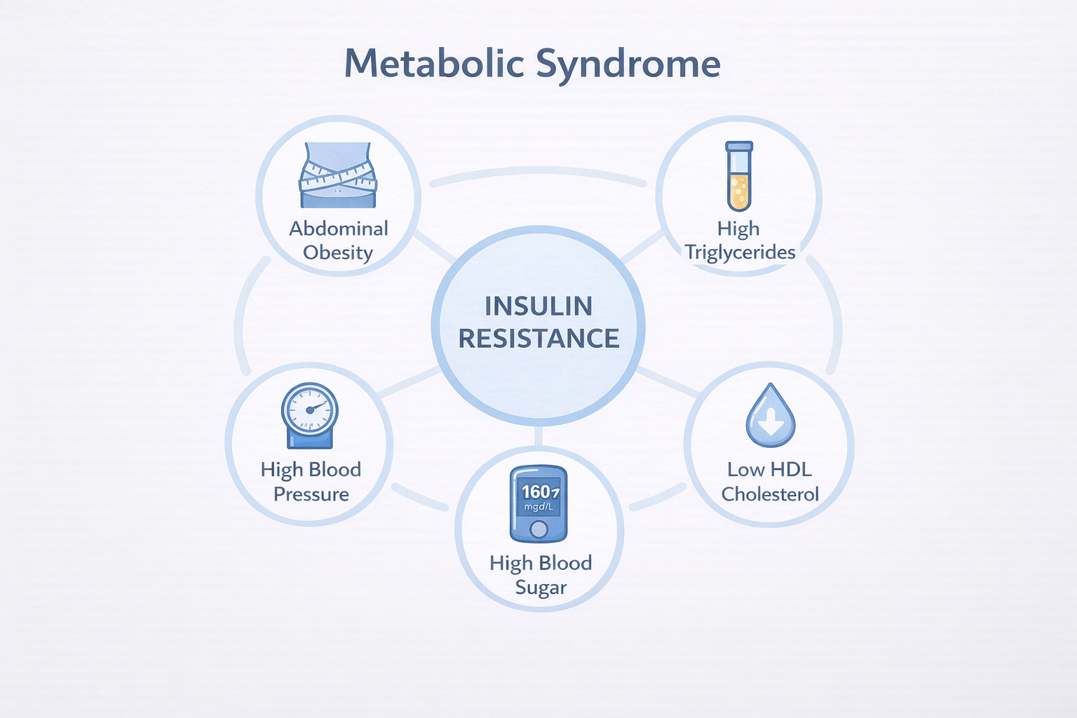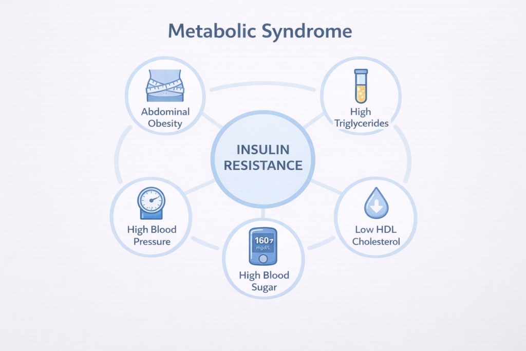 The “syndrome” part simply means it’s a group of conditions that tend to occur together — not a single disease. Insulin resistance is the common factor: when your cells stop responding well to insulin, your body compensates by producing more insulin, which triggers a chain reaction that affects your blood sugar, blood pressure, cholesterol, and body weight.