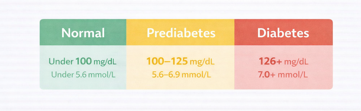 A fasting blood sugar of 100 mg/dL (5.6 mmol/L) or higher is one of the five metabolic syndrome criteria. Levels between 100–125 mg/dL (5.6–6.9 mmol/L) indicate prediabetes; 126 mg/dL (7.0 mmol/L) or above on two separate tests indicates type 2 diabetes. Always consult your doctor for a proper diagnosis.