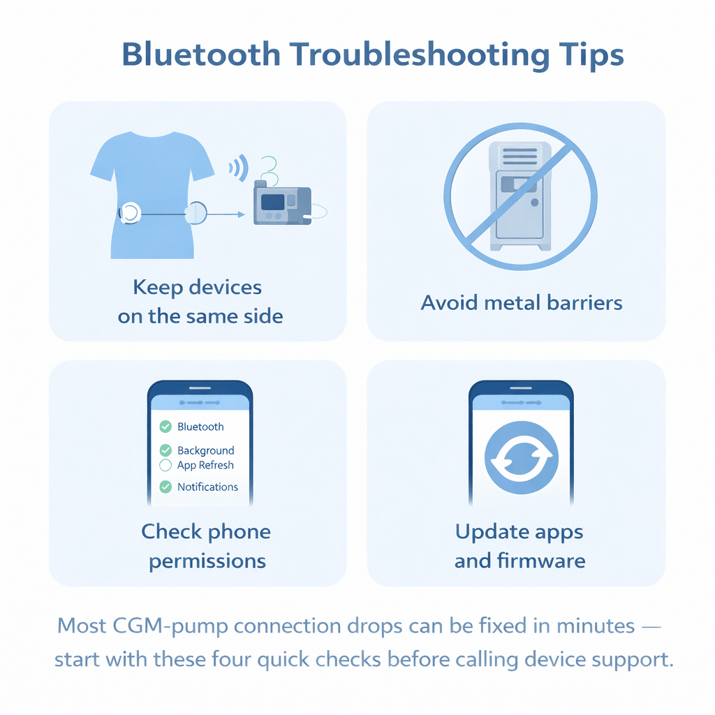 Most modern diabetes devices connect locally via Bluetooth Low Energy (BLE). BLE is energy-efficient and designed for small data bursts, making it ideal for CGM readings and pump commands. However, real-world conditions can interfere: crowded 2.4 GHz environments (such as schools, gyms, and offices), metal barriers (like lockers), and phone settings (background permissions) can cause signal drops. Most of these drops can be fixed with a few simple steps.