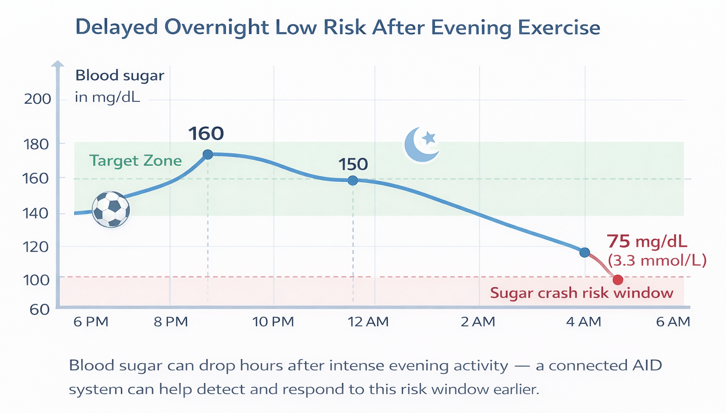 Connected systems can analyze your blood sugar trends, insulin history, and activity signals to identify higher-risk periods after intense workouts. Some people find it helpful to set a higher overnight target or plan a snack when exercise increases the risk of a late low.